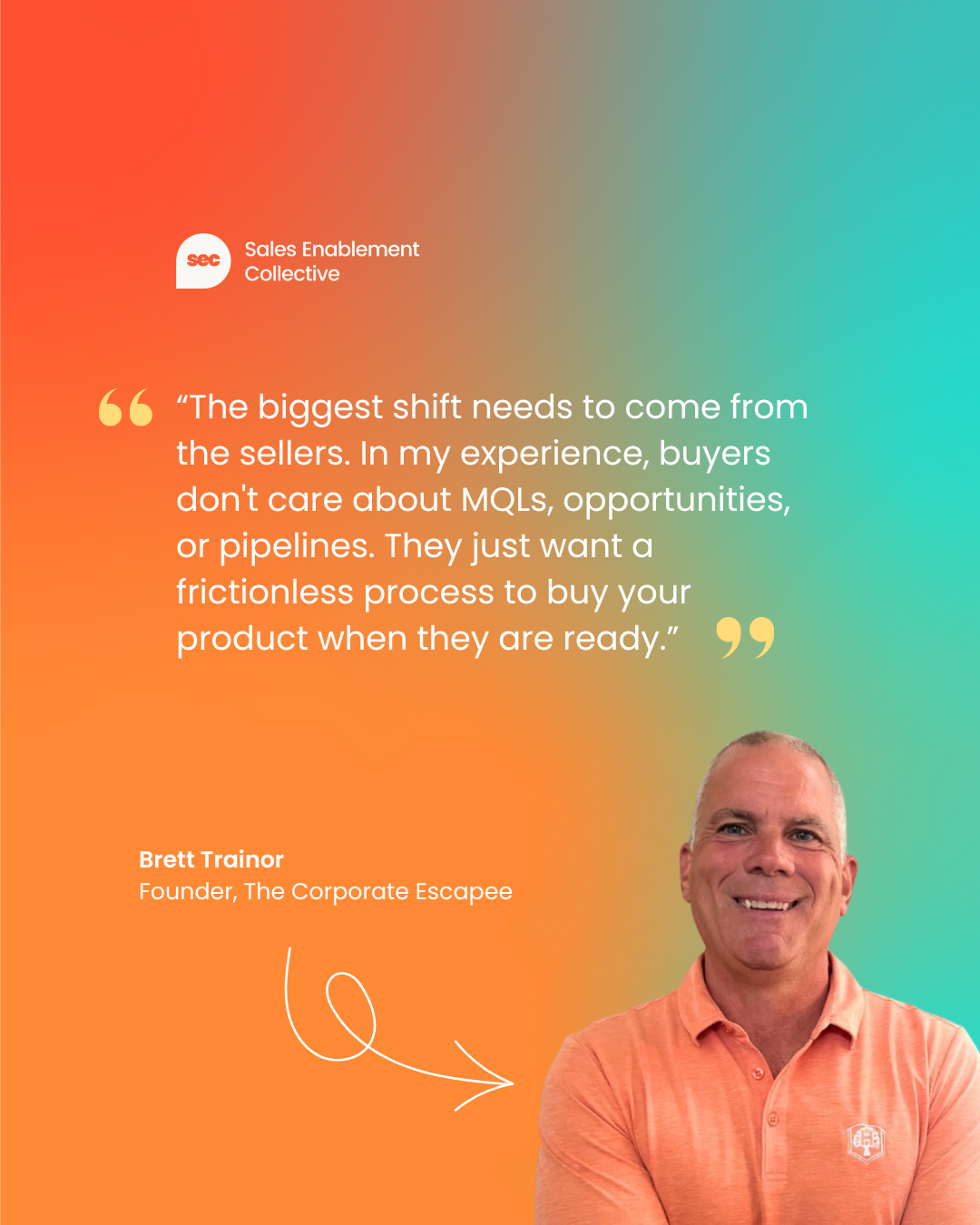 “The biggest shift needs to come from the sellers. In my experience, buyers don't care about MQLs, opportunities, or pipelines. They just want a frictionless process to buy your product when they are ready”.