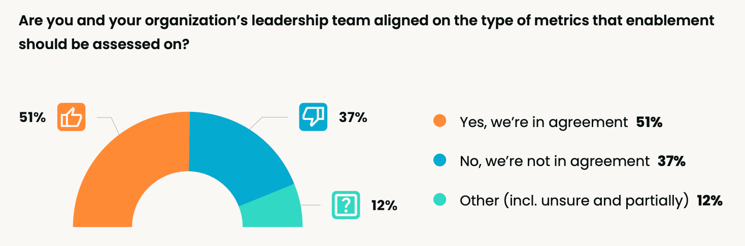 - Indirect results – 37% of respondents in our 2024 Sales Enablement Landscape Report said they were not on the same page as their leadership teams when it comes to what metrics enablement should be assessed on. This disconnect in understanding where and how enablement can offer value is often amplified in partner enablement, where there are more degrees of separation between actions and results.