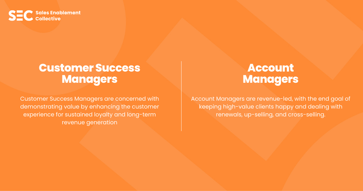 - Aligning customers' goals with company objectives: CSMs and AMs aim to create synergy between what customers want to achieve and company growth priorities.