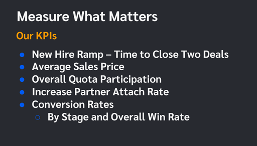 "Drive growth revenue and a net renewal rate that exceeds the company's metrics. We align directly to those numbers. That gives us a lot of credibility with the sales team, because we're not measured on QSO's or qualified leads. We're measured directly to those top line numbers. Then we break that down into key performance metrics that matter to the business."