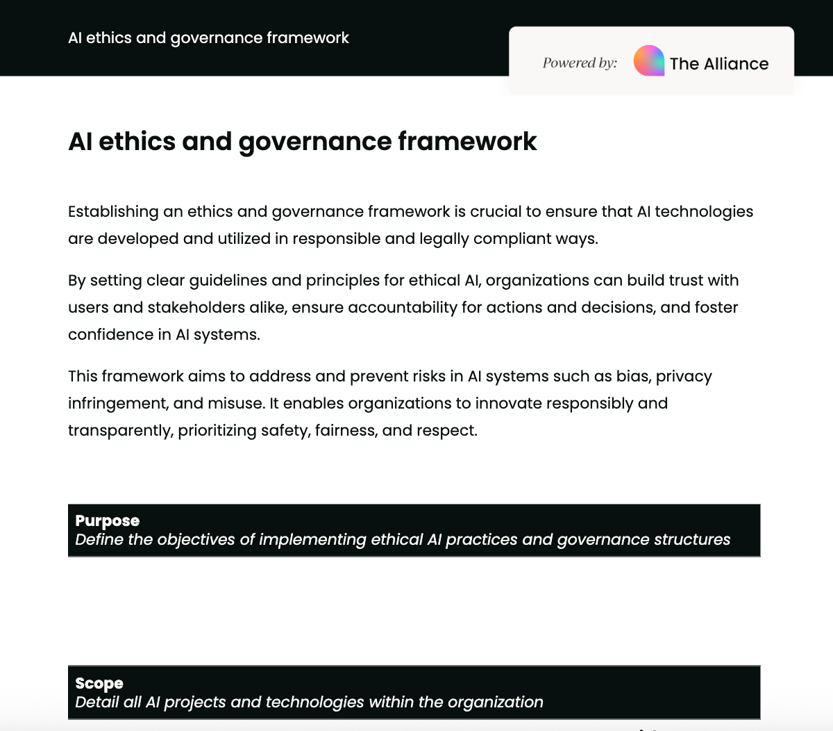 The AI ethics and governance framework template is a ready-to-use guide for establishing clear policies, roles, and processes around how AI is designed, deployed, and monitored in your organization.