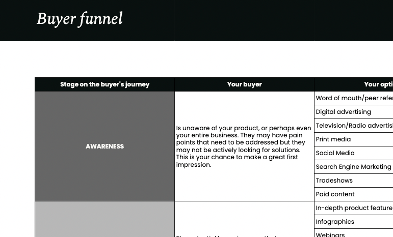 The template covers the five key stages of the buyer funnel, and provides options for each: