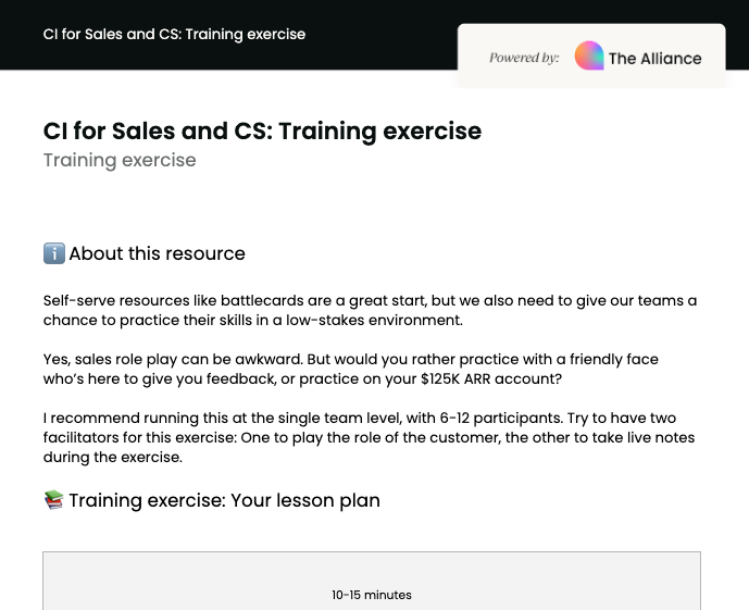 Our competitive intelligence training exercise provides a hands-on, low-stakes environment where team members can practice handling competitive scenarios and refine their approach to differentiation.