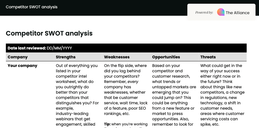 Our competitor SWOT analysis template is a resource used by competitive intelligence and sales enablement professionals to evaluate the Strengths, Weaknesses, Opportunities, and Threats (SWOT) of your company in comparison to your competitors.