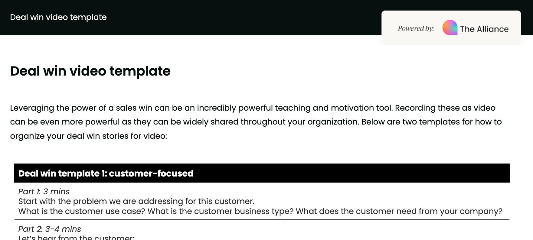 These videos serve as useful tools for internal learning, motivation, and sharing best practices across your organization. The template provides a structured approach to crafting these stories, ensuring that the key elements of each deal are effectively communicated.