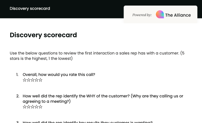 The scorecard consists of a series of targeted questions that evaluate the key elements of a discovery call. Each question is rated on a 5-star scale, allowing for a detailed assessment of the sales rep's performance in specific areas.