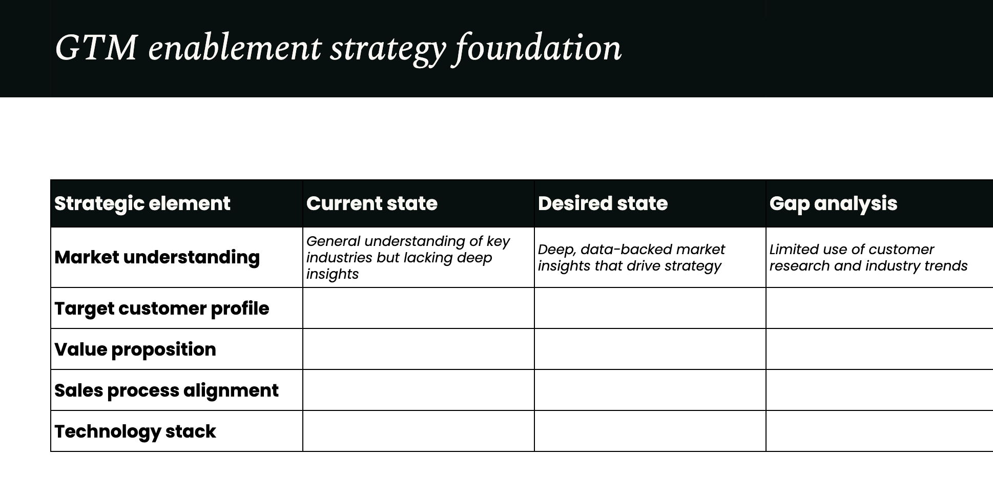 By mapping out each component, this template ensures that every team involved in your GTM motion—sales, product, marketing, and customer success—is equipped with the knowledge, tools, and skills they need to drive revenue.
