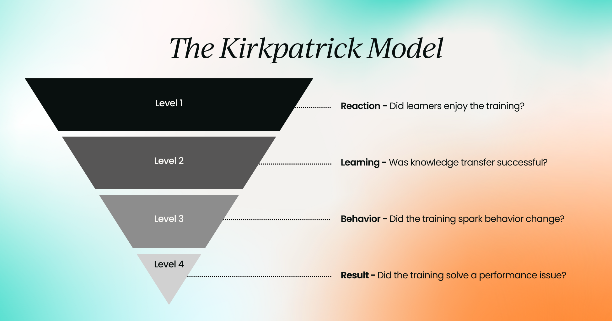 To prove value, we follow the Kirkpatrick Model (L1-L4).