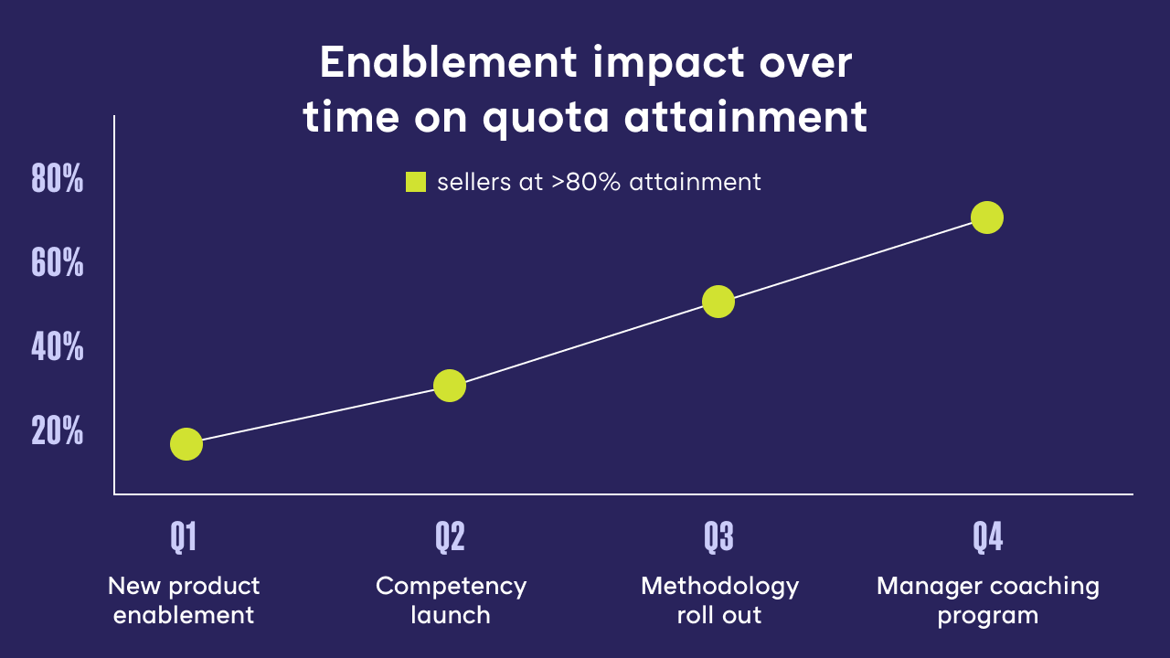 It’s important to remember that success at the initiative level feeds into success at the function level. For example, if your goal is for 80% of sellers to hit 80%+ quota attainment, you’ll want to showcase and visualize how each individual enablement program (e.g. product launch enablement, methodology roll out, competency training, and coaching for managers) over time builds into aggregate impact.