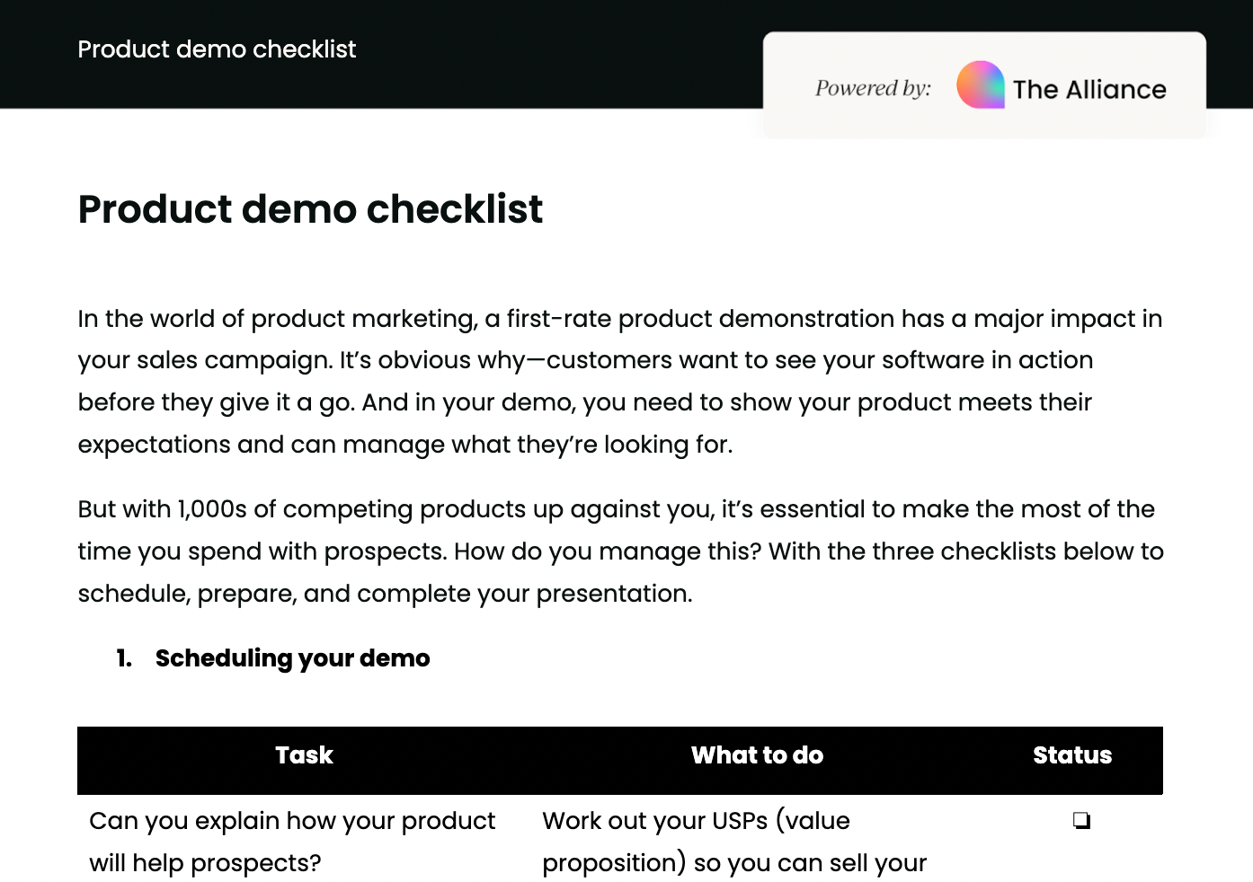 - What to do during the demo: The checklist guides marketers on how to structure the demo itself, such as starting with the most relevant USP to grab attention, focusing on value rather than just features, and keeping the language clear and jargon-free. It also highlights the importance of sticking to the schedule and leaving time for Q&A sessions to engage with prospects directly.