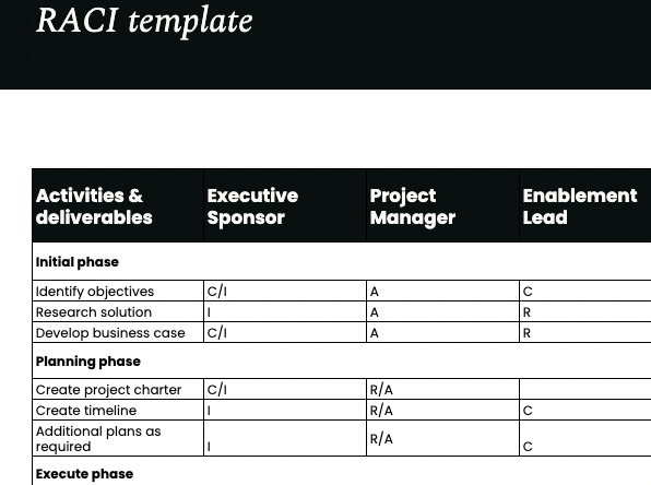 Sales enablement professionals often use the RACI matrix to streamline coordination between different teams, especially when implementing new initiatives like training programs, sales tools, or content strategies.