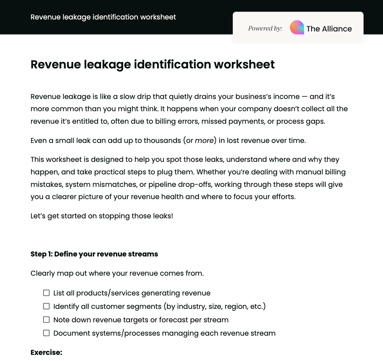 The revenue leakage identification worksheet is a hands-on tool that walks you through seven steps to uncover, understand, and prevent lost revenue. It starts by helping you map out your revenue streams and ends with practical guidance for long-term monitoring.
