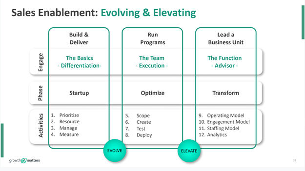 "Demand Gen messaging, sales administration. To me that's the scope of sales enablement. So sales enablement to me is not just training. That's not the verb I would use. Let's elevate our function and evolve our role to become that strategic advisor."