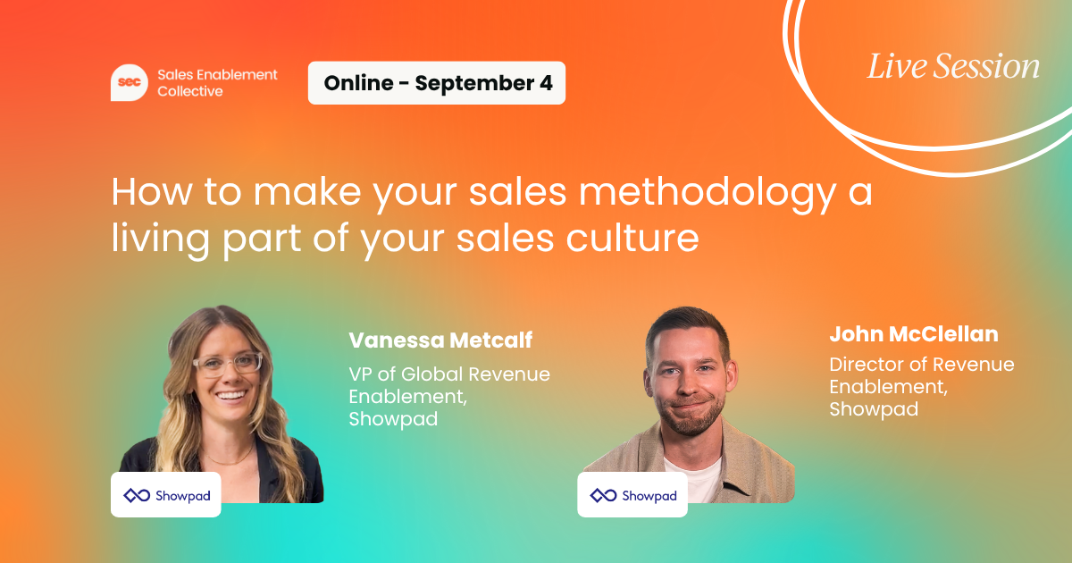 Join John McClellan, Director of Revenue Enablement, Showpad, and Vanessa Metcalf, VP of Global Revenue Enablement, Showpad on September 4 for a complimentary live session about how to make your sales methodology stick.
