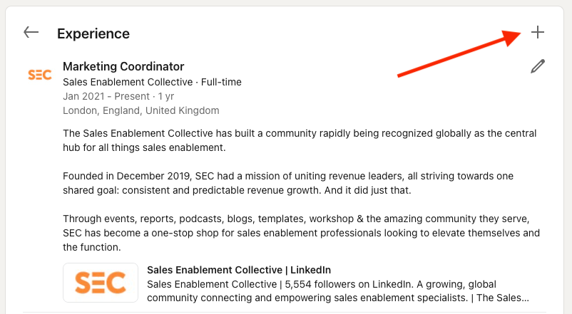 ...and scroll your way down to the ‘Experience’ section. Once you’re there, click the + button in the top right corner.