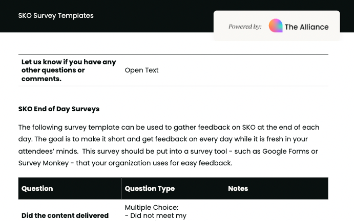 Use it as a guide to help put together your surveys for your sales kickoff, including your pre-SKO survey, daily survey, and post-SKO survey. Make sure to modify the template to match your organization and your sales kickoff.