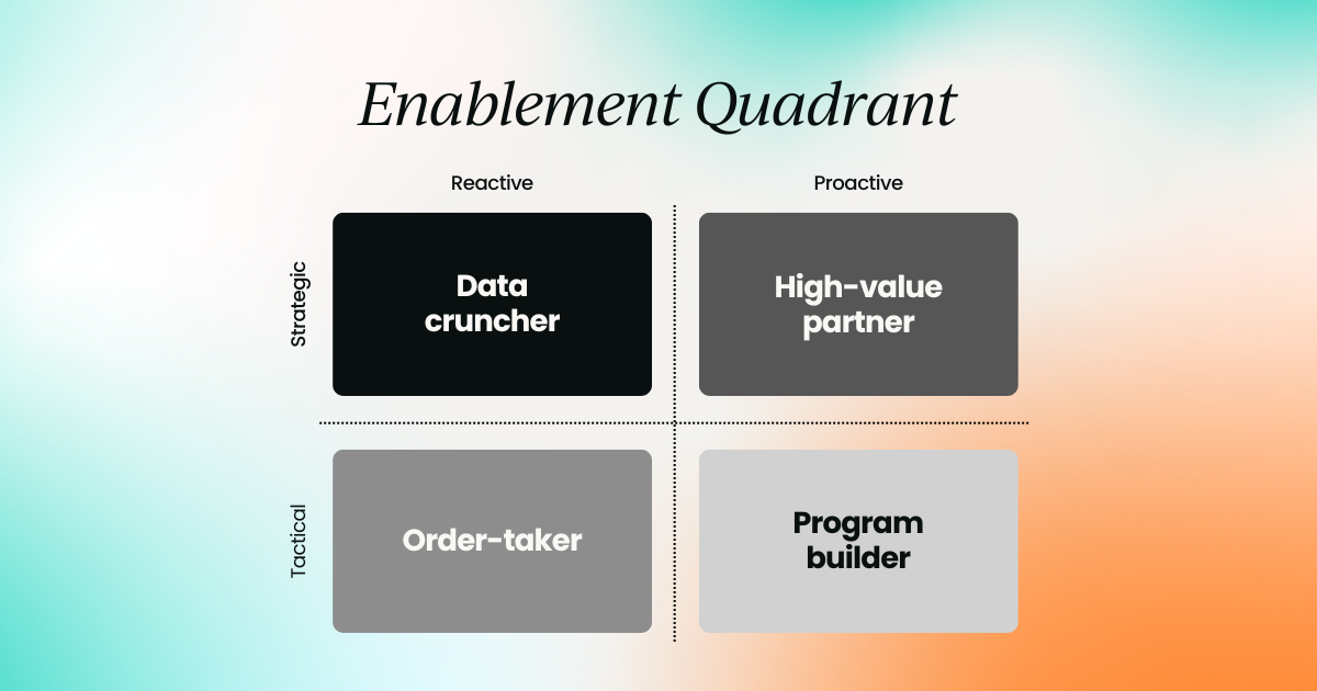 Most enablement teams are full of generalists – program managers who do a bit of everything. One day you're working on onboarding, the next day there's a product launch, the day after that someone needs negotiation training. You know what happens? Everyone stays tactical and reactive by default.
