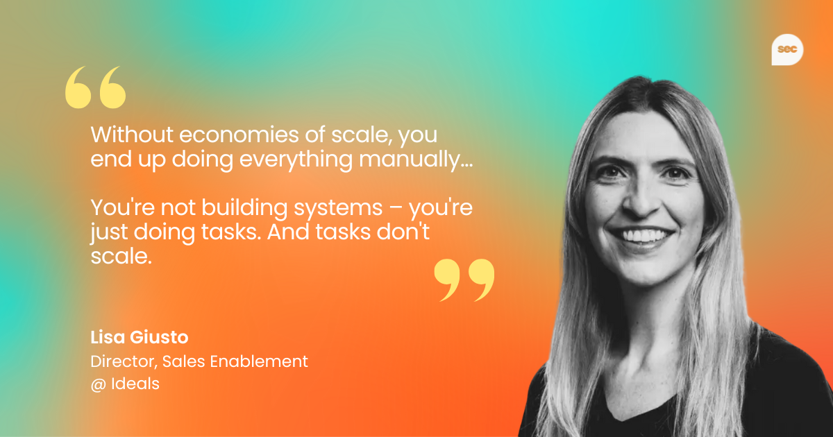 Without economies of scale, you end up doing everything manually. Creating the same training deck for the fifteenth time. Running the same objection handling session every quarter. You're not building systems – you're just doing tasks. And tasks don't scale.