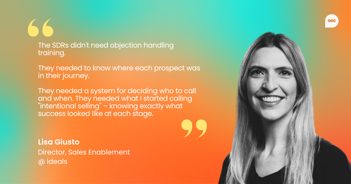 The SDRs didn't need objection handling training. They needed to know where each prospect was in their journey. They needed a system for deciding who to call and when. They needed what I started calling "intentional selling" – knowing exactly what success looked like at each stage.