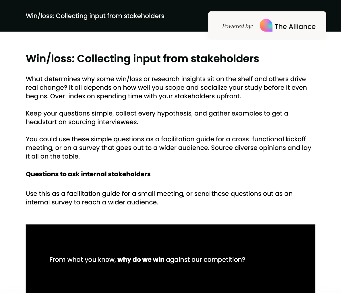 Prompt stakeholders with focused questions, like:- “From what you know, why do we win against our competition?”