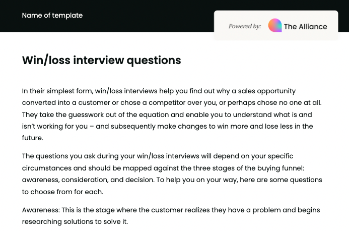 Our win/loss interview questions template gives you all the prompts you need to understand why a sales opportunity resulted in either a win (a new customer) or a loss (choosing a competitor or no one at all).